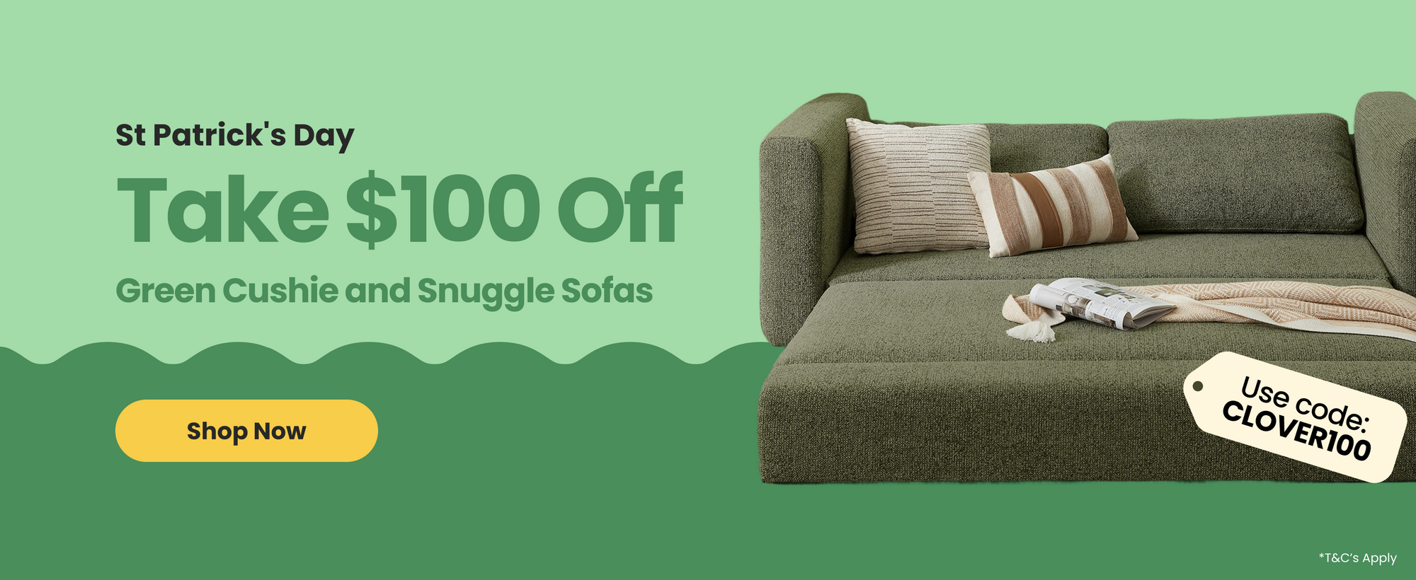 St Patrick's Day - Take $100 off green Cushie and Snuggle sofas
